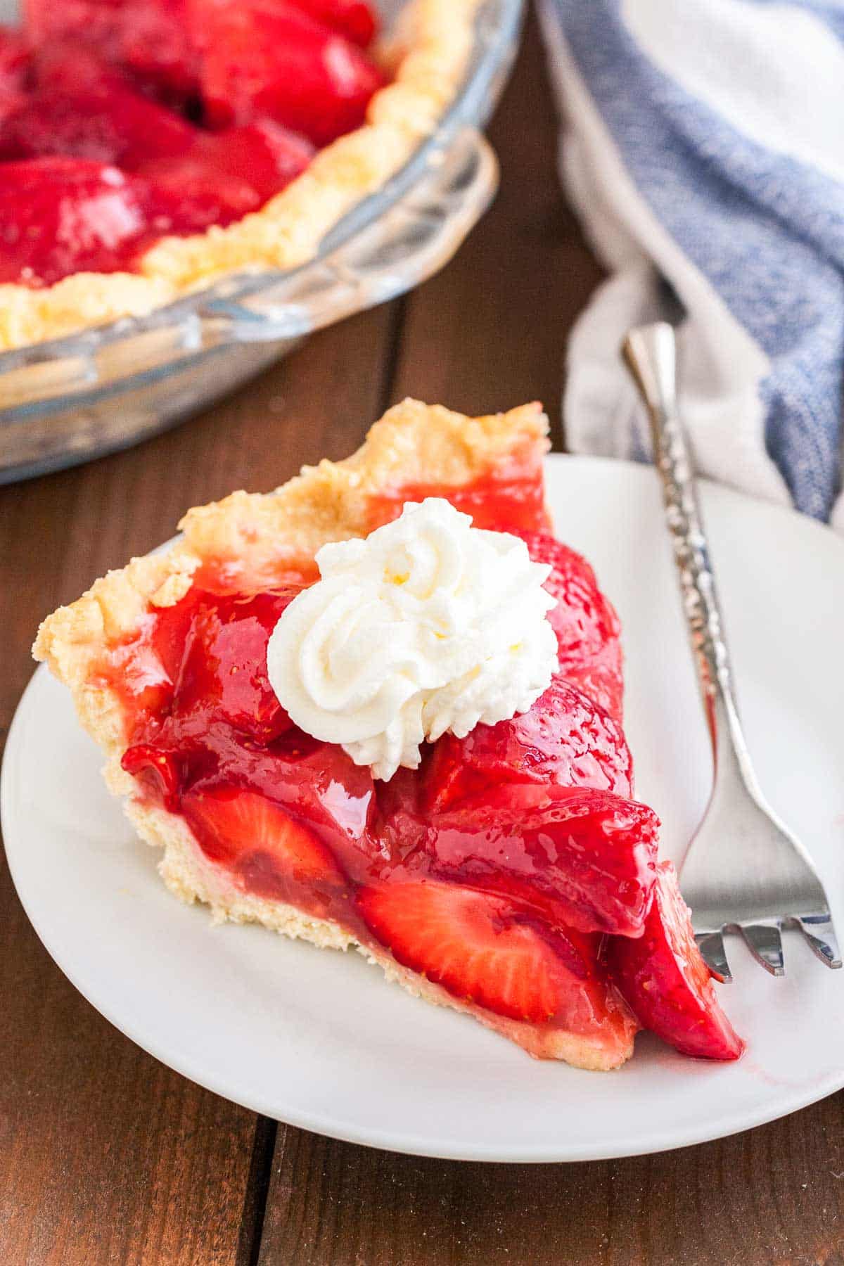 This fresh strawberry pie is made 100% from scratch without Jell-O. My homemade glaze enhances the natural sweetness and flavor of the berries. Served with a mound of whipped cream, it’s a fresh, vibrant treat that reminds me of summers at my grandparents’ house.