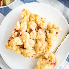 Apples on a shortbread base with a thick layer of butter streusel on top. This is the sheet cake version you’d get at a German bakery, baked on a big tray and cut into squares.